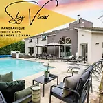 Вилла Sky View Cinema, Piscine, Spa предлагает бассейн, 4 спальни, а также террасу, откуда открывается вид на бассейн. В комнатах предоставляется диван, письменный стол и компьютер, а на оснащённой всем необходимым кухне - электрочайник, духовка и кухонная утварь.